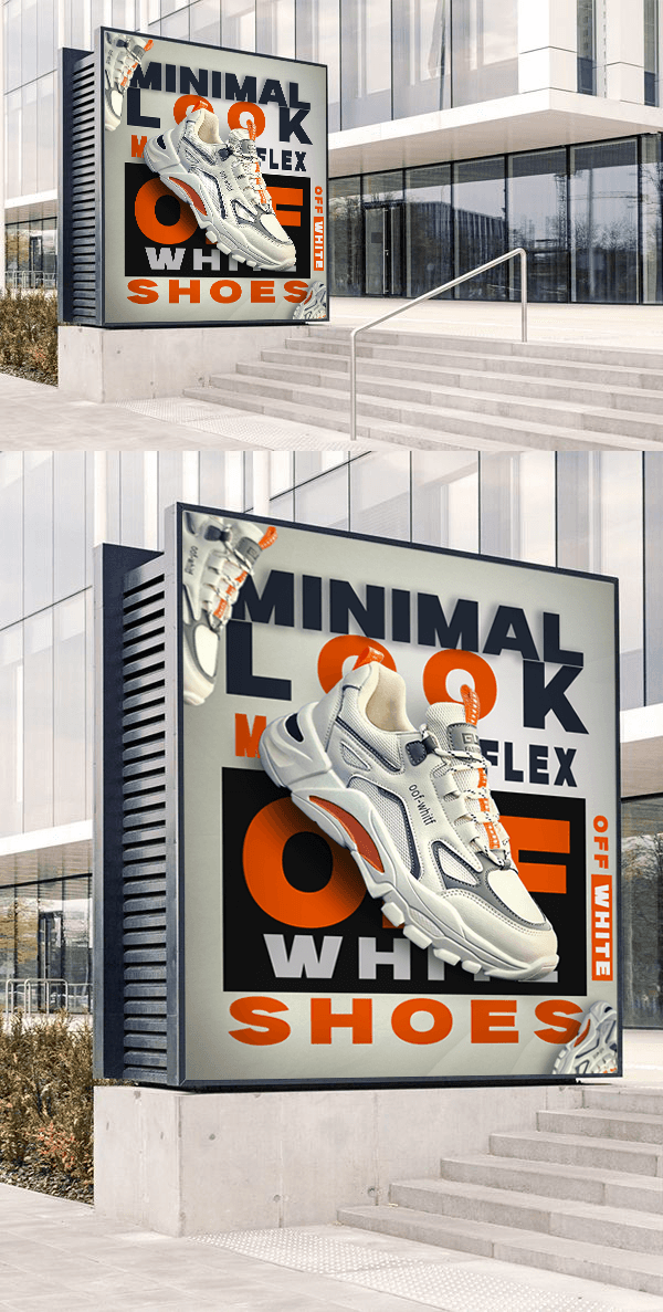 This minimal look off-white shoes graphic design by Sunny Graphic UI is built around bold typography, clean layout, and strong visual balance. The oversized text, sharp color contrast, and dynamic shoe placement create a modern and eye-catching composition. This design style focuses on clarity and impact, making the product the center of attention while maintaining a minimal and premium aesthetic.